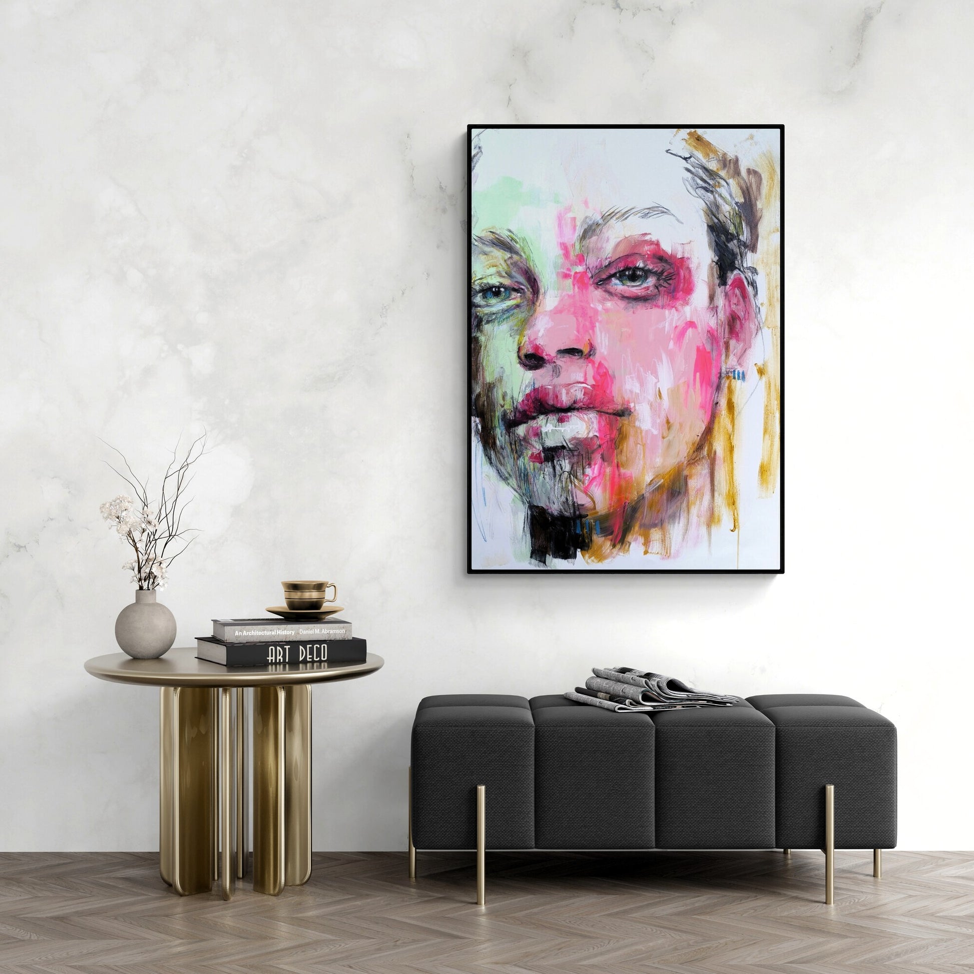 The canvas is about 10 centimeters larger than the dimensions shown to allow for a frame and is shipped rolled in a tube to preserve the quality of the painting.