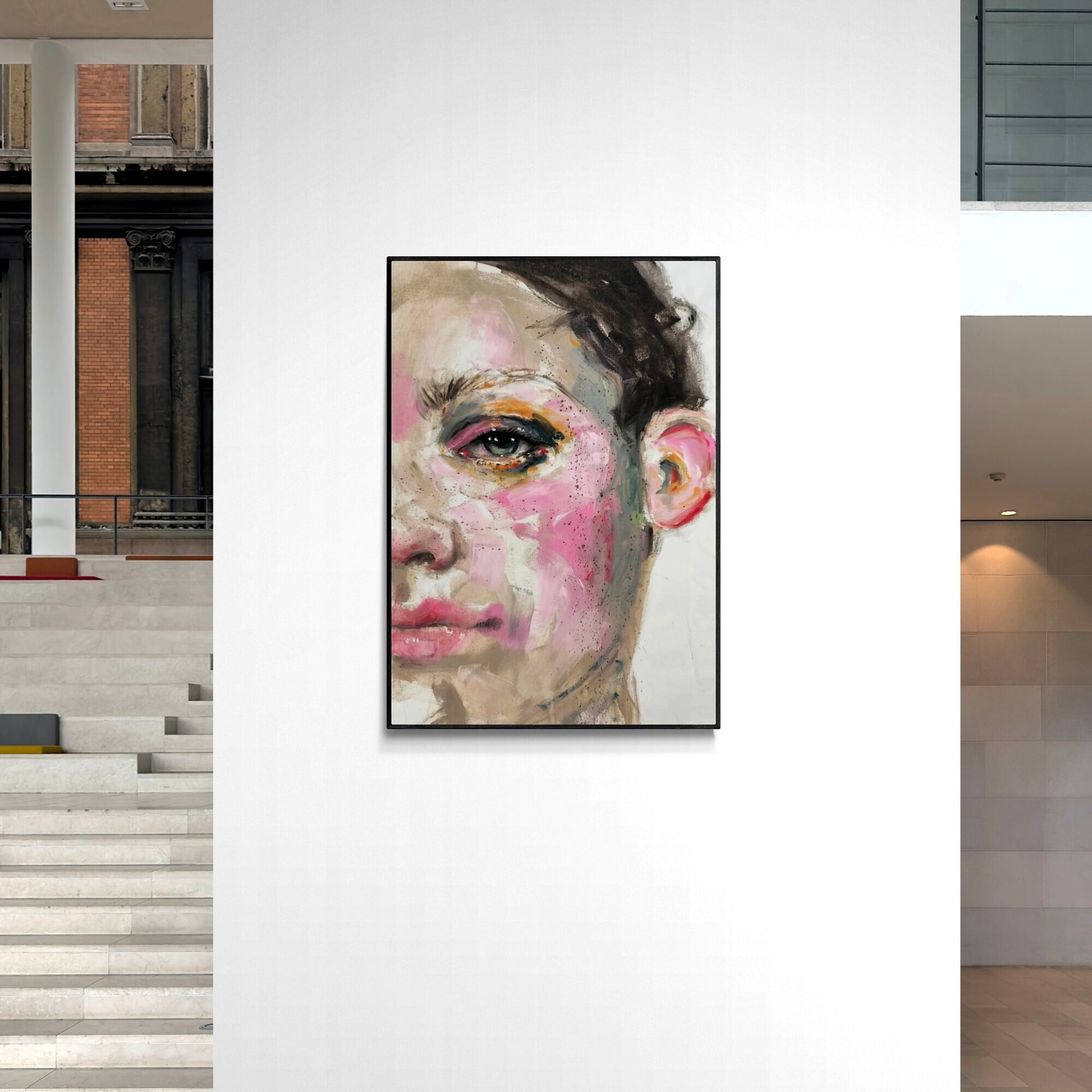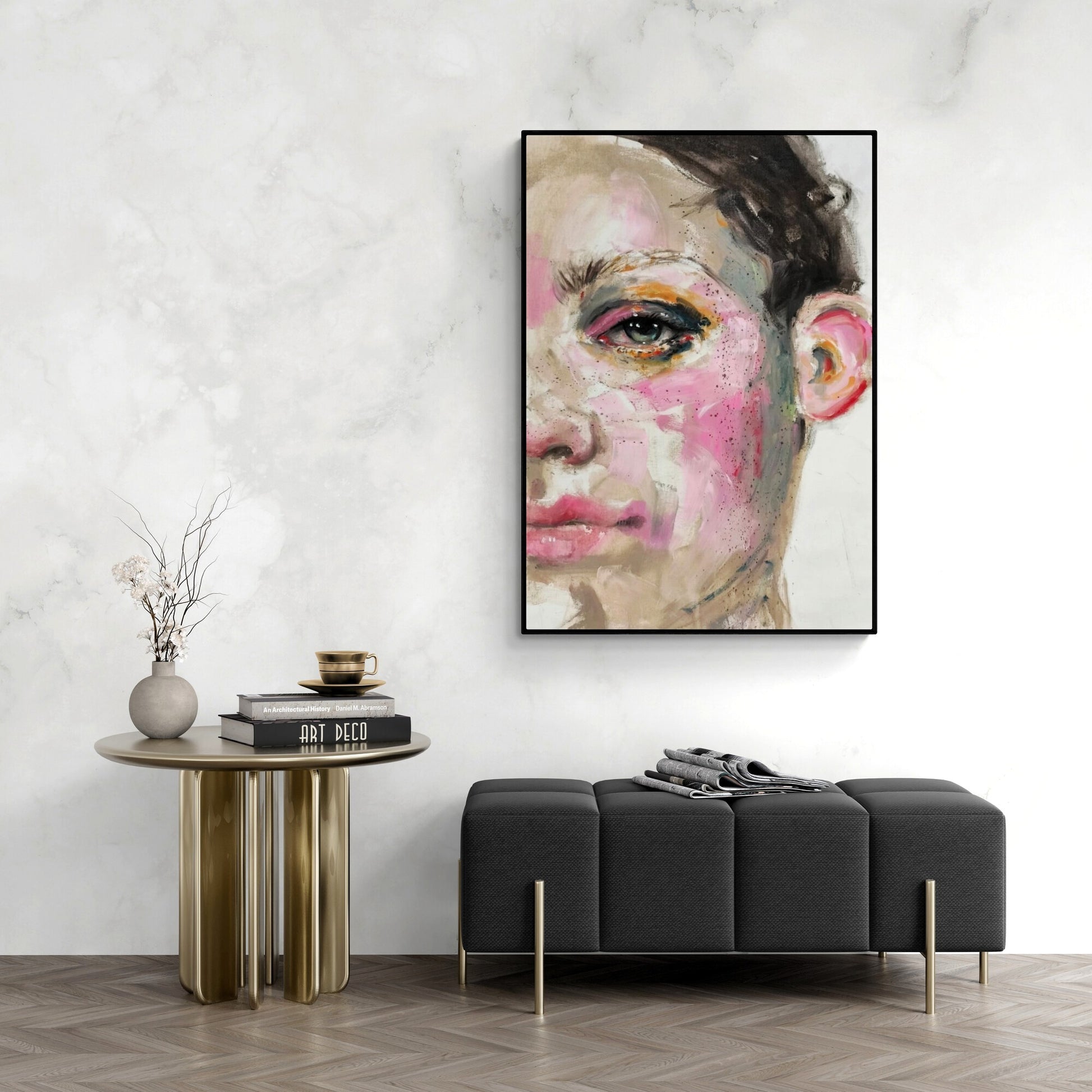The canvas is about 10 centimeters larger than the dimensions shown to allow for a frame and is shipped rolled in a tube to preserve the quality of the painting.