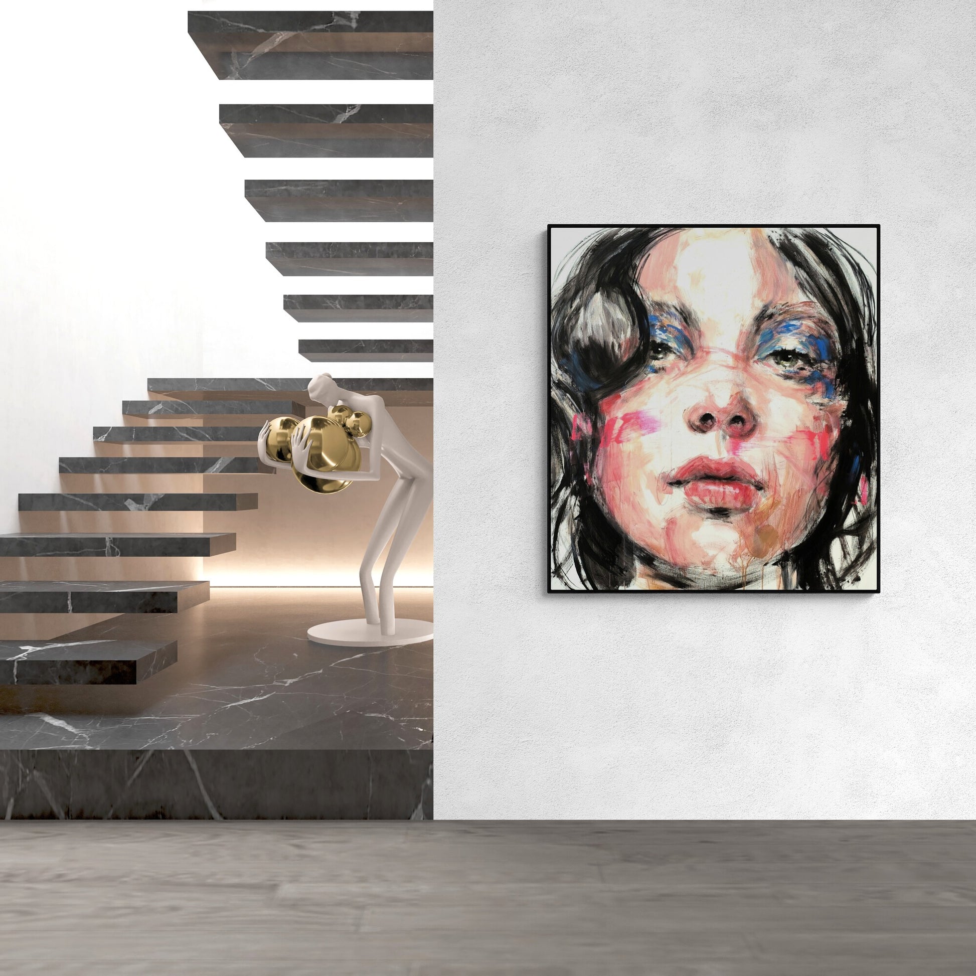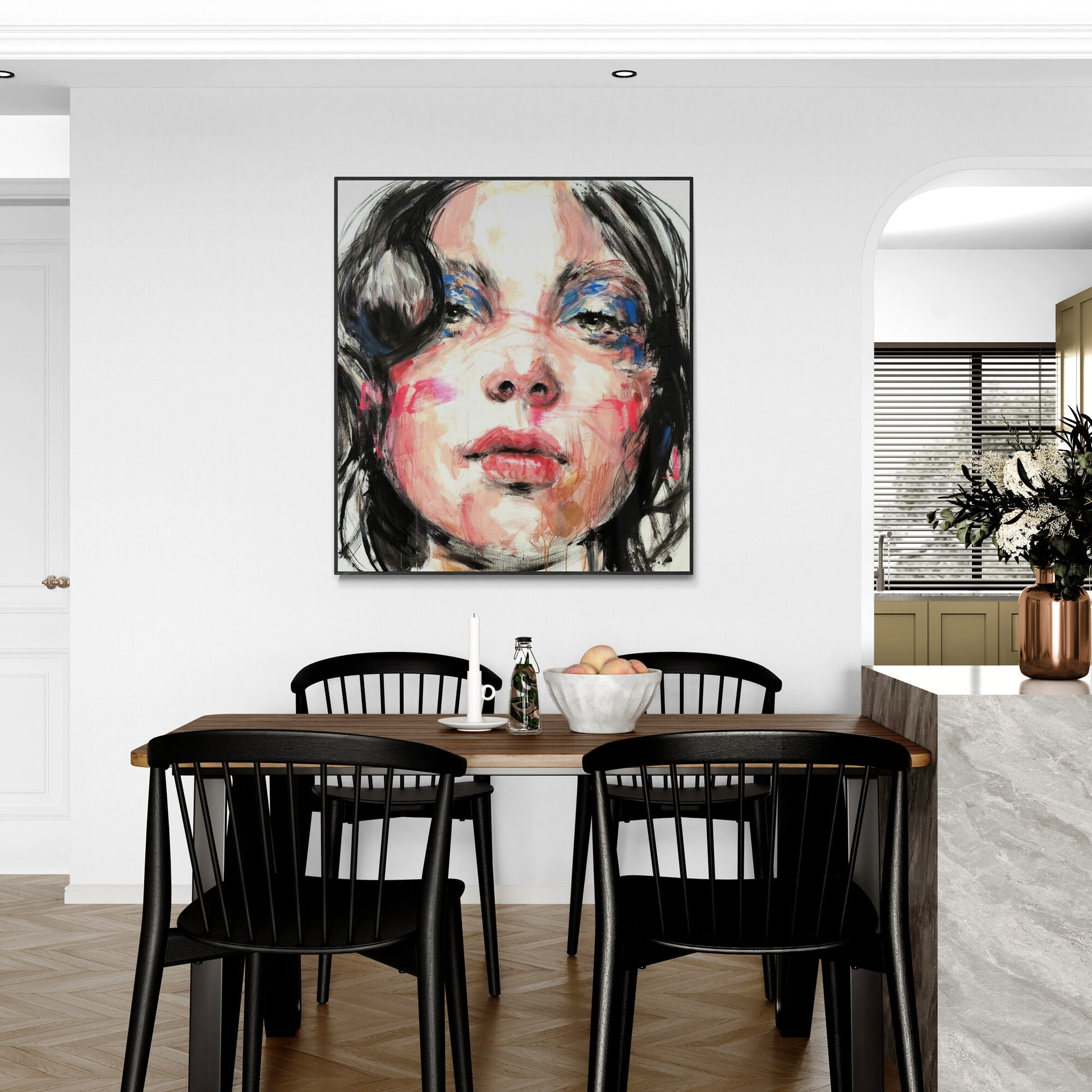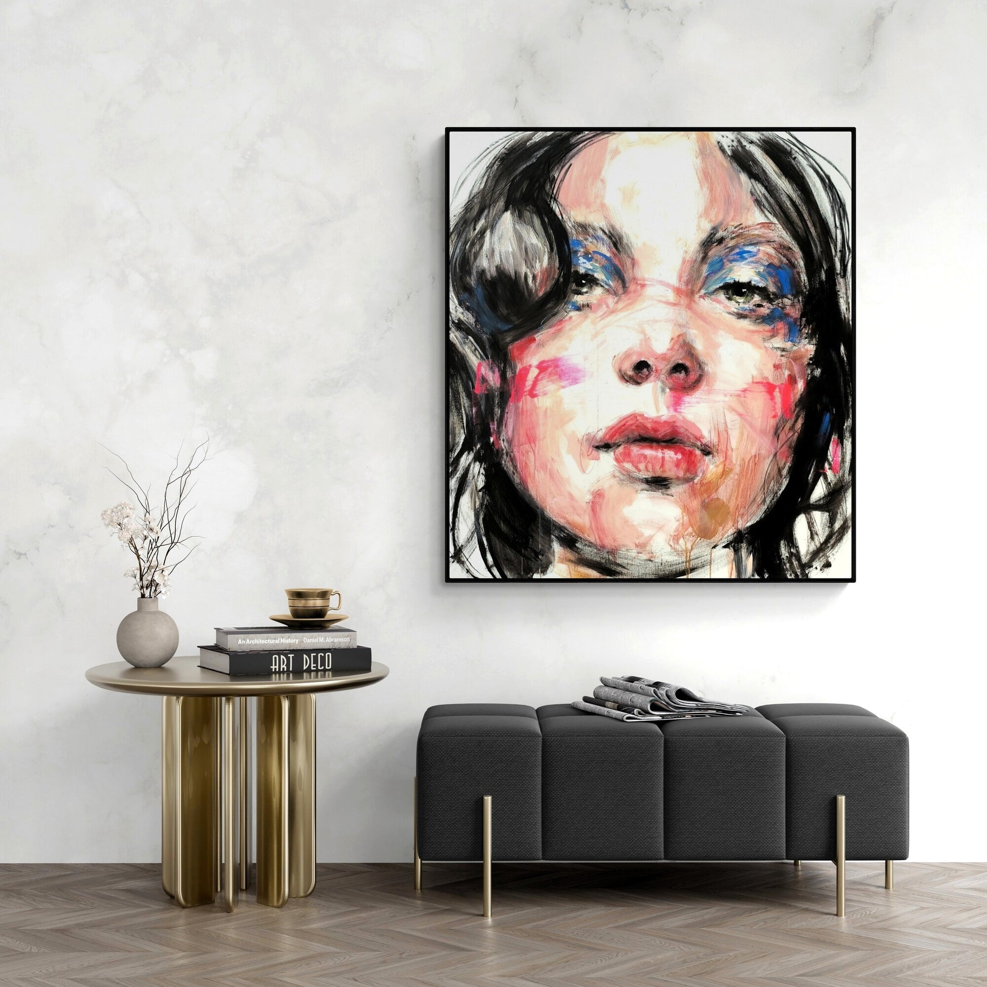 The canvas is about 10 centimeters larger than the dimensions shown to allow for a frame and is shipped rolled in a tube to preserve the quality of the painting.