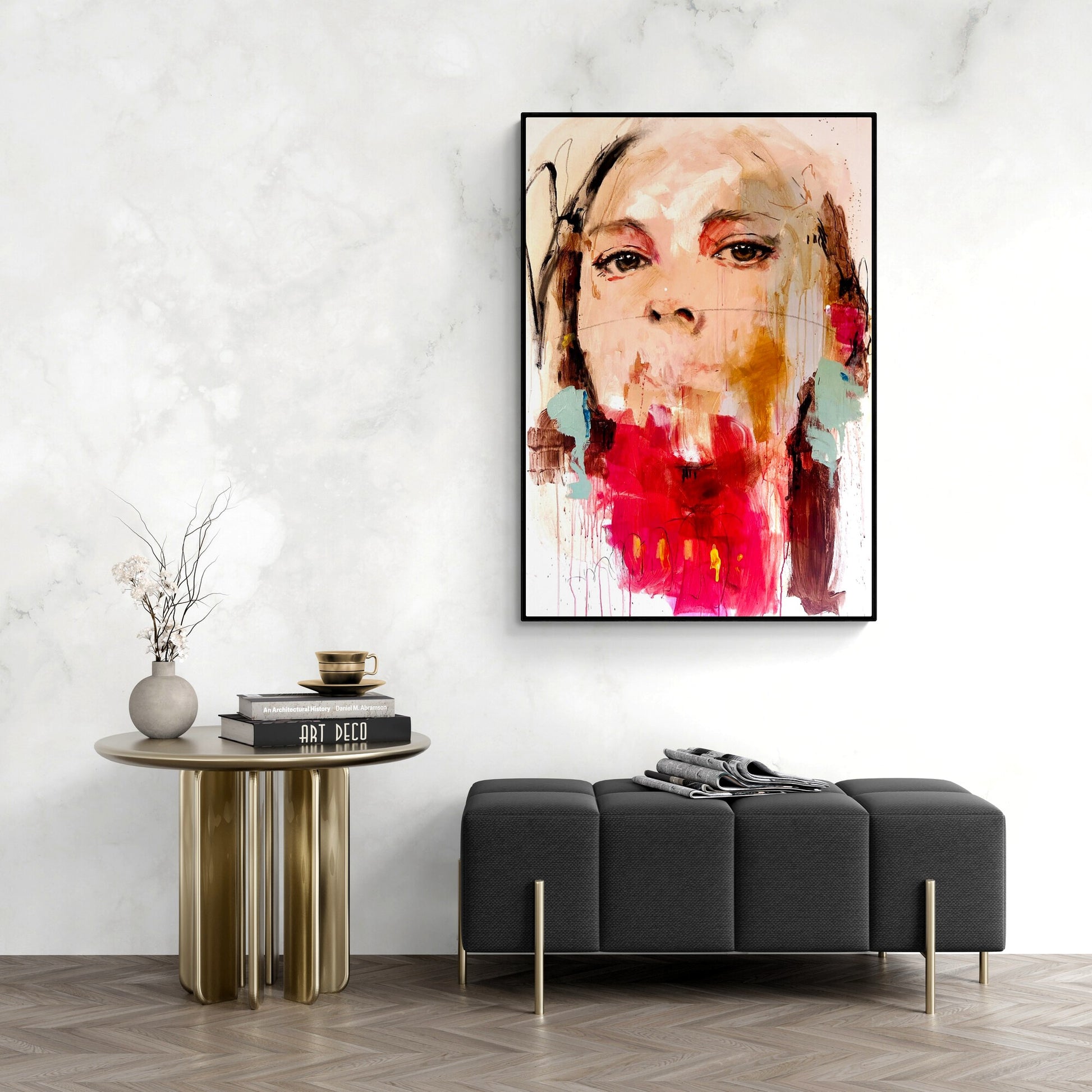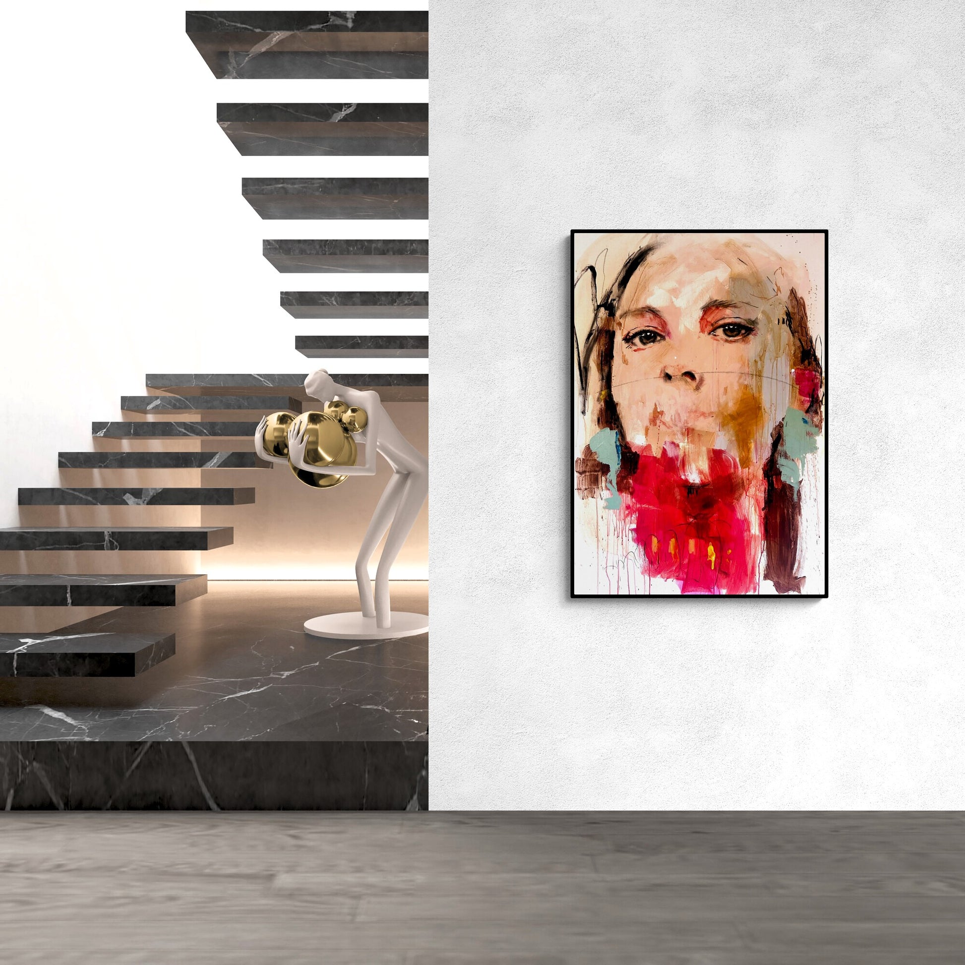 The canvas is about 10 centimeters larger than the dimensions shown to allow for a frame and is shipped rolled in a tube to preserve the quality of the painting.