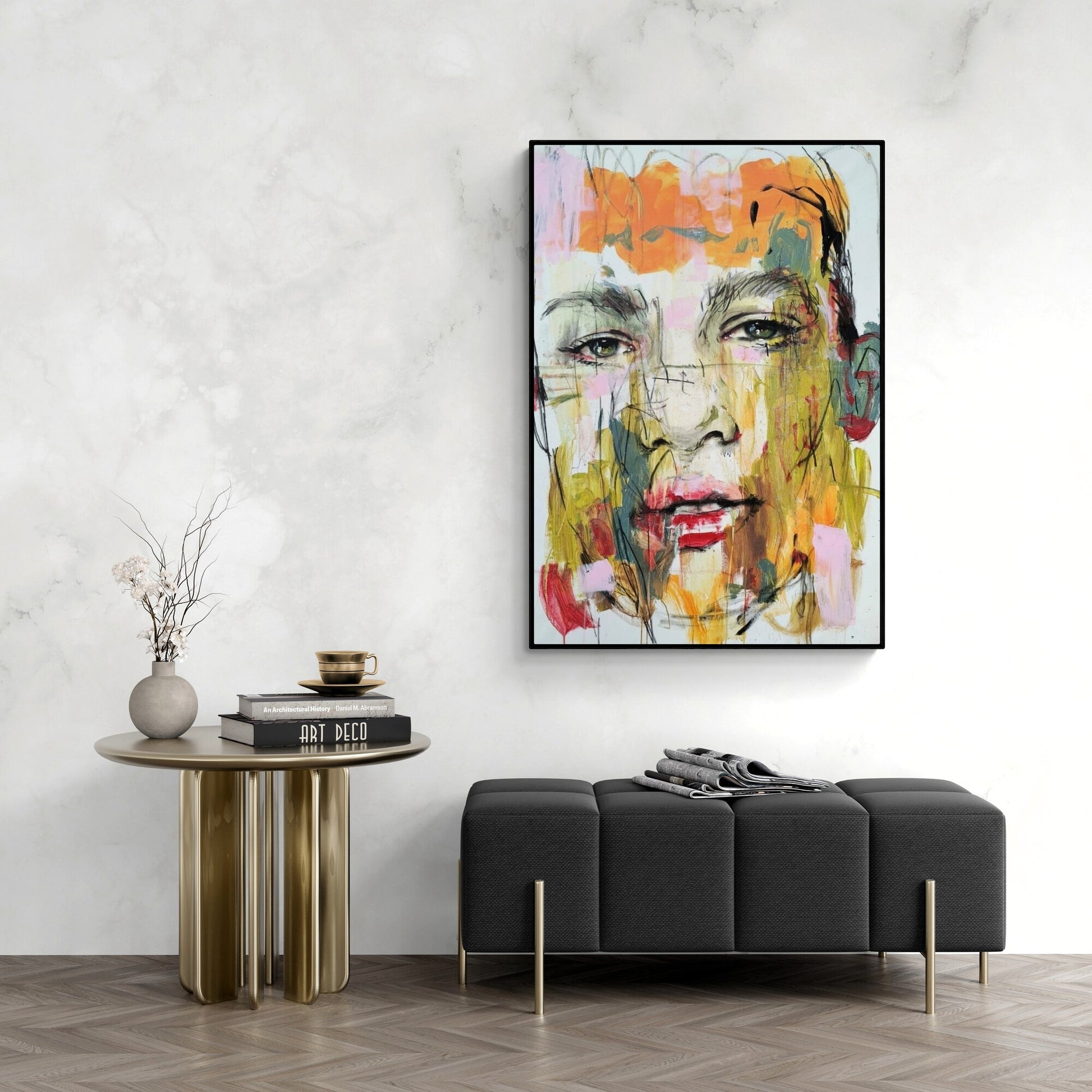 The canvas is about 10 centimeters larger than the dimensions shown to allow for a frame and is shipped rolled in a tube to preserve the quality of the painting.